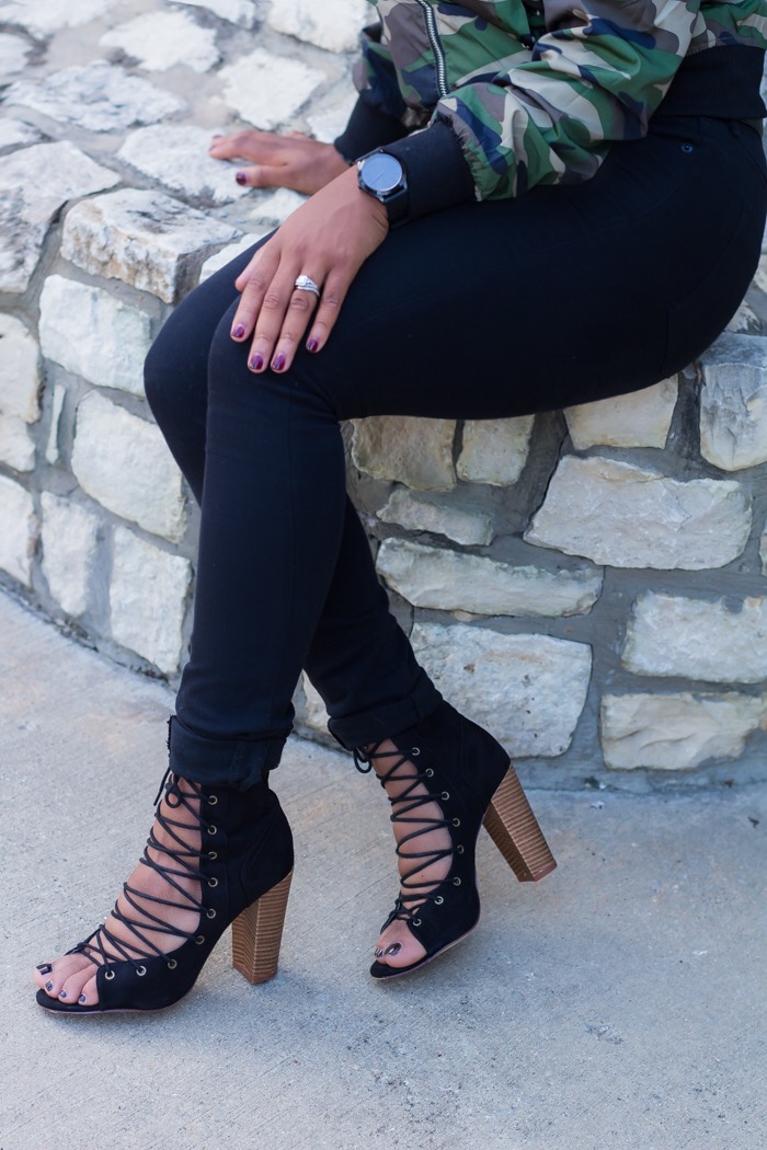 Camo heels: Now let me just say this…Not all camo heels are a favorite of mine. Some look very cheap, and I would never wear. I found a couple pairs that were subtle enough that still were stylish for my taste. Just keep the rest of your outfit using solid colors, such as all olive or black.