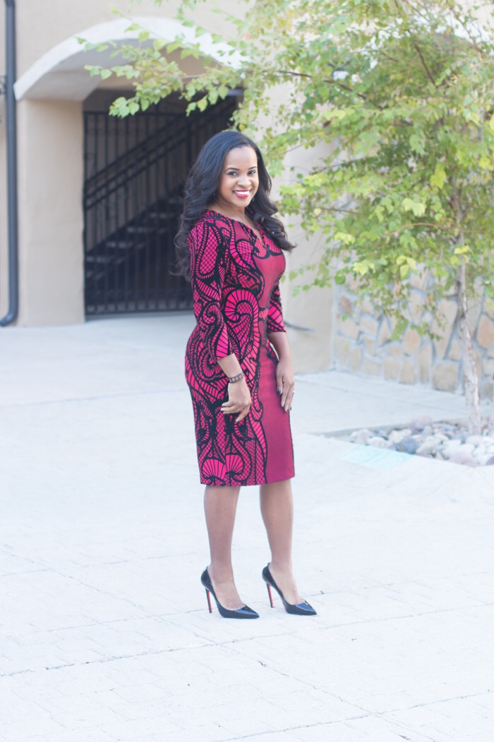 For me personally whenever I think of holiday parties I always gravitate to a fun statement color. This dress instantly caught my eye for my husband’s work party. It isn’t too dress, little bit a class, and you can’t forget some glam appeal. What I love about this is the black print is velvet, which I am equally obsessed with.