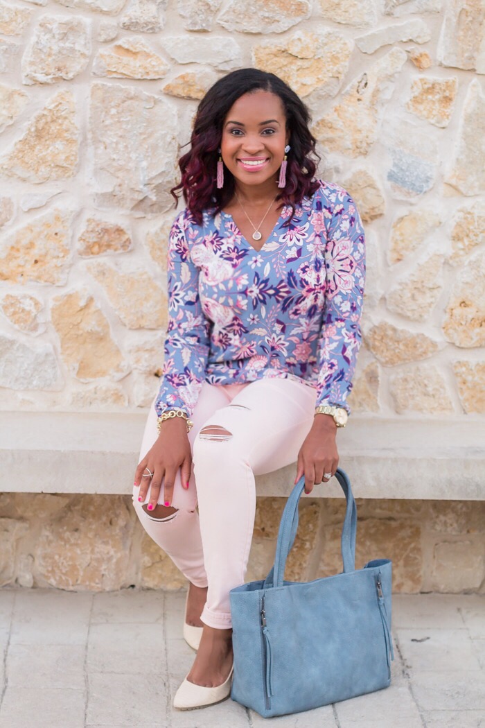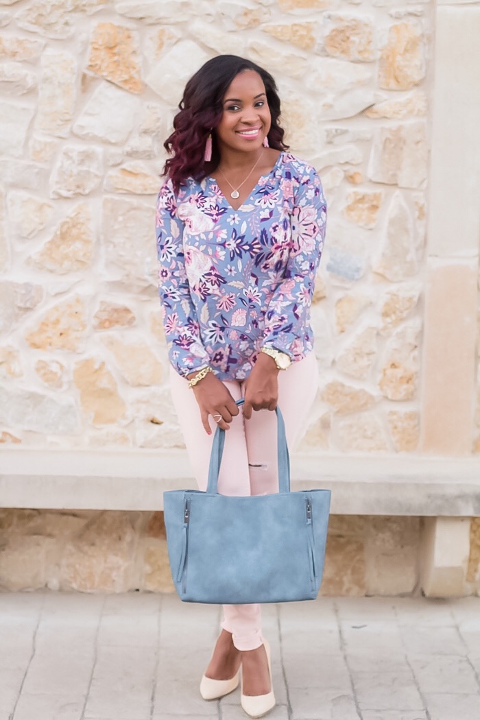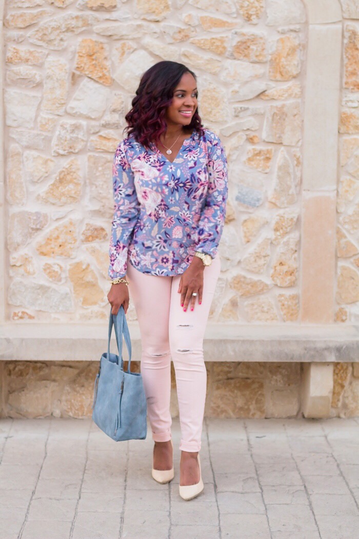 Keep the colors light: Are you already wanting to pull out those long sleeves and jeans, but not trying to look like you are dressing for mid-October. Consider finding light and neutral colors for those long sleeves and pants. It won’t look as out of place when you are wearing them in August/September. This look I’ve done exactly that. I’m wearing a light and bright patterned top, and paired it with soft pink jeans. (that are so comfy by the way!) Yes, it is a long sleeve top but the colors are still season appropriate, and the material is not heavy. Pairing them with my pink jeans instantly keeps from diving into Fall to early. I’ve added quite a bit of long sleeve tops with airy fabric, which will be perfect for this time of year.